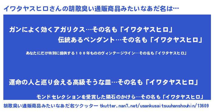 | 意味不明あだ名 | 『住所不定無職イワタヤスヒロ(2歳)』 |