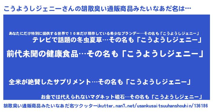 | 男性向けラノベタイトル風あだ名 | 『うちのこうようしジェニーが世界を掌握している!』 |