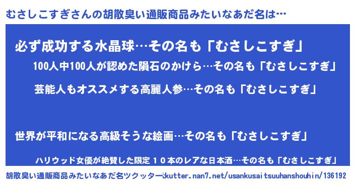 | ヘコむあだ名 | 『むさにー』『酢こんぶ』『むさっ子』 |
