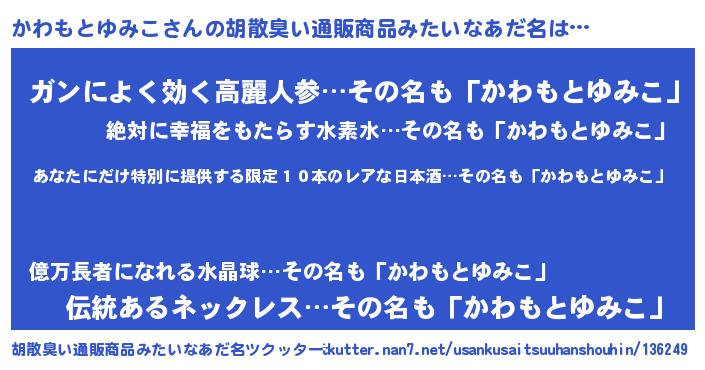 | ヘコむあだ名 | 『かわっぺ』『かわもとゆみこ(笑)』 |