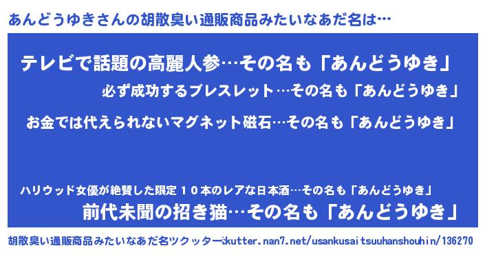 | ヘコむあだ名 | 『あんどうゆき(笑)』『あんふぇ~』 |