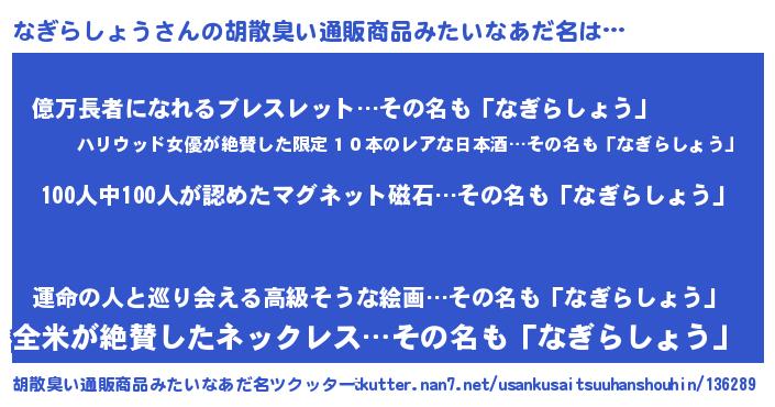 | 男性向けラノベタイトル風あだ名 | 『おまえをオタクにしてやるから、俺をなぎらしょうにしてくれ! 』 |