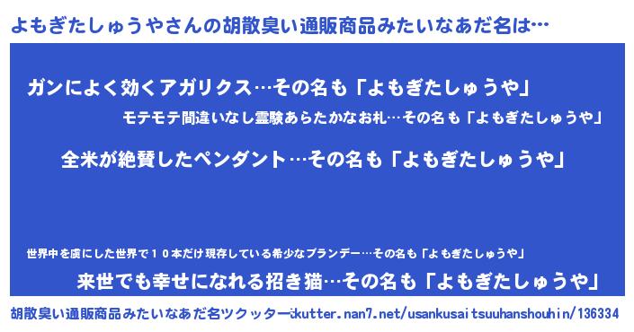 | 欧米人風あだ名 | 『ウサインよもぎたしゅうや』 |