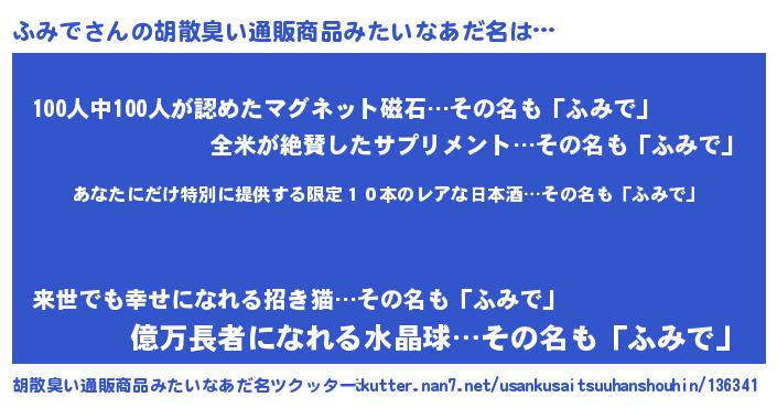 | 意味不明あだ名 | 『住所不定無職ふみで(65歳)』 |
