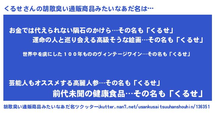 | ヘコむあだ名 | 『くるせ(笑)』『豆乳』『くるぷりん』 |