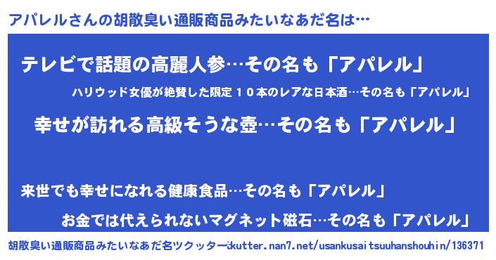 | 恥ずかしいあだ名 | 『アパっちょ』『アパレルデラックス』 |