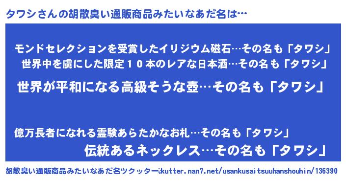 | ヒーロー風カッコイイあだ名 | 『ウルトラタワシマン』『銀牙騎士タワ』 |