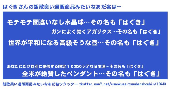 | ヘコむあだ名 | 『豆乳』『はぐにゅー』『はぐぷりん』 |