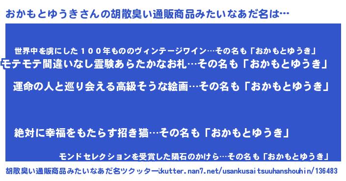 | 男性向けラノベタイトル風あだ名 | 『おかもとゆうき~年齢イコール彼女いない歴の魔法使い~』 |