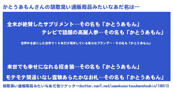 | 意味不明あだ名 | 『住所不定無職かとうあもん(71歳)』 |