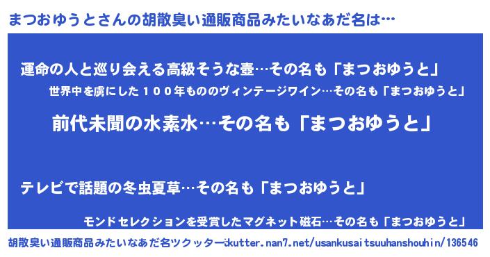 | ヘコむあだ名 | 『まつおゆうと(震え声)』『酢こんぶ』 |