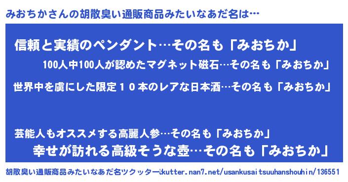 | 意味不明あだ名 | 『住所不定無職みおちか(39歳)』 |