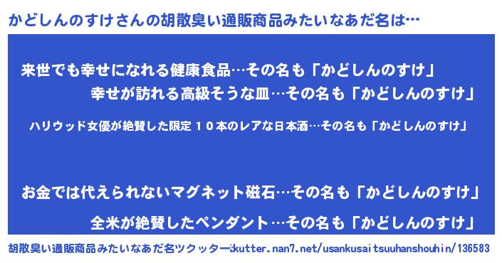 | 男性向けラノベタイトル風あだ名 | 『魔弾の王とかどしんのすけ』 |