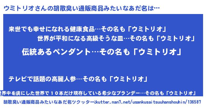 | 男性向けラノベタイトル風あだ名 | 『ダンジョンにウミトリオを求めるのは間違っているだろうか』 |