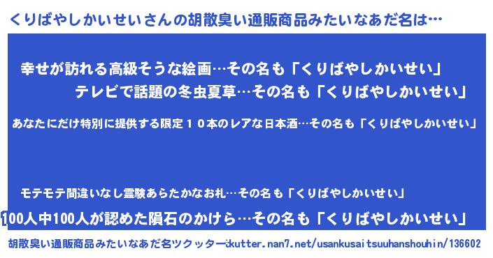 | 男性向けラノベタイトル風あだ名 | 『うちのくりばやしかいせいが世界を掌握している!』 |