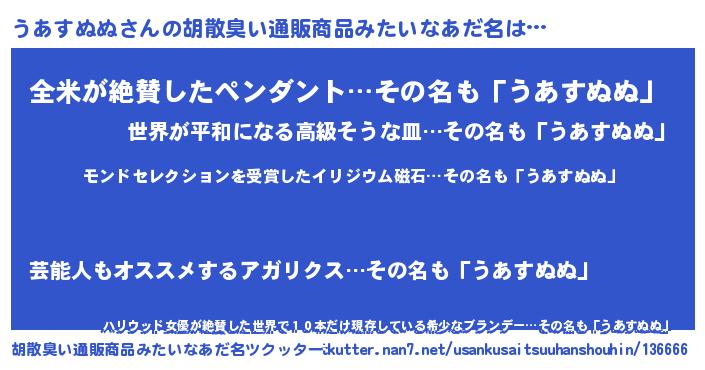 | 男性向けラノベタイトル風あだ名 | 『ノーゲーム・ノーウアスヌヌ』 |