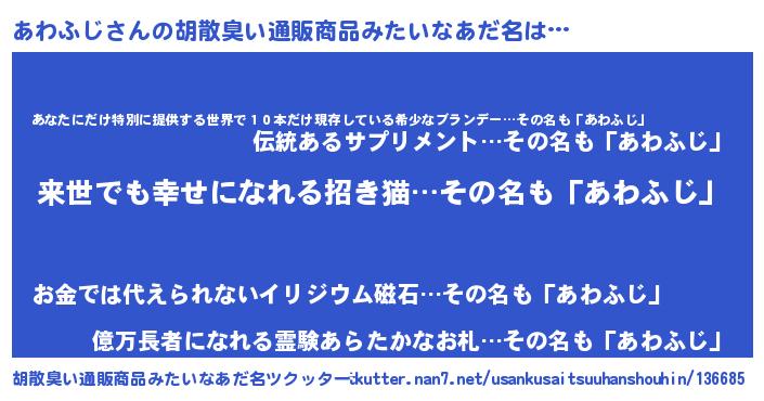 | 男性向けラノベタイトル風あだ名 | 『あわふじに滅ぼされるだけの簡単なお仕事です』 |