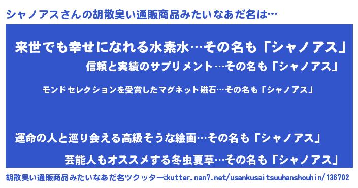 | ヒーロー風カッコイイあだ名 | 『慈愛の使者シャノアス』『黄金騎士シャ』 |