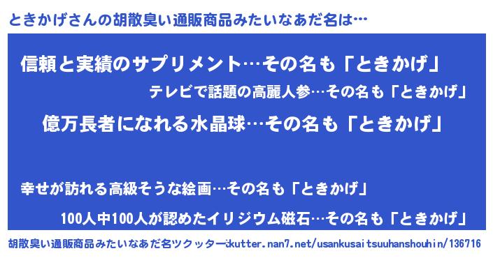 ヘコむあだ名 | 『ときにゅー』『とき太郎』 |