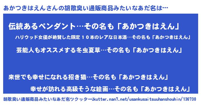 | 意味不明あだ名 | 『自称あかつきはえん』 |