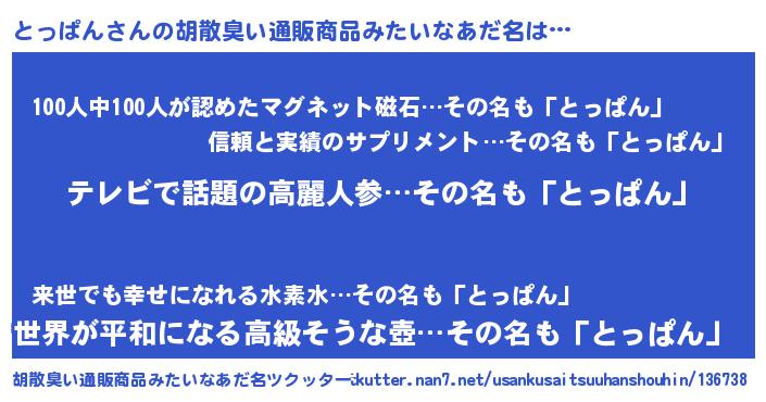| 意味不明あだ名 | 『自称とっぱん』『とっぱんフォーエバー』 |