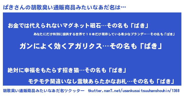 | ヘコむあだ名 | 『ばきにゅー』『ばき(小並感)』 |
