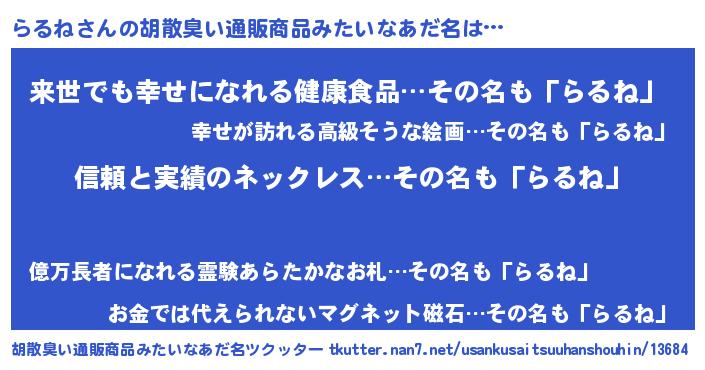 | 料理風あだ名 | 『らるねごはん』『満腹らるねマフィン』 |