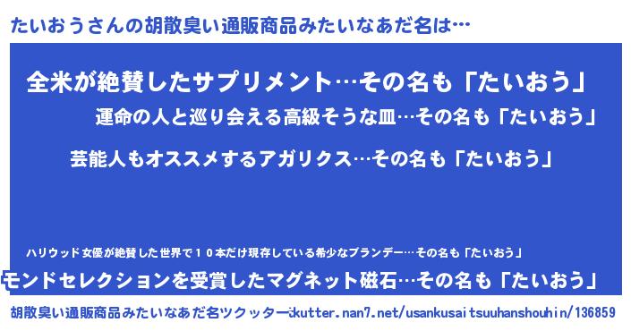| 男性向けラノベタイトル風あだ名 | 『Re:たいおうから始める異世界生活』 |