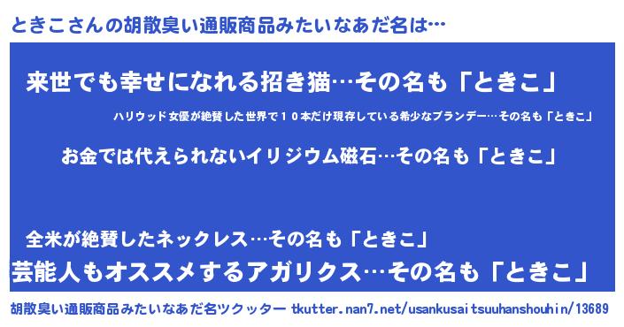 | ヘコむあだ名 | 『ときこ(爆)』『ときお』『酢こんぶ』 |