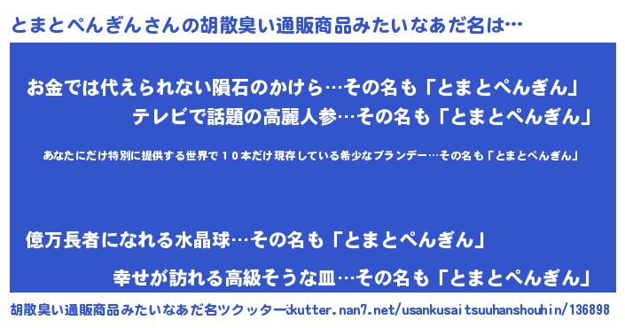 | 意味不明あだ名 | 『住所不定無職とまとぺんぎん(77歳)』 |
