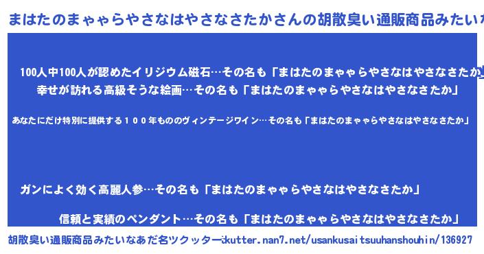 | 意味不明あだ名 | 『住所不定無職まはたのまゃゃらやさなはやさなさたか(8歳)』 |