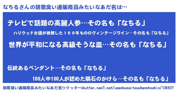 | 男性向けラノベタイトル風あだ名 | 『転生したらなちるだった件』 |
