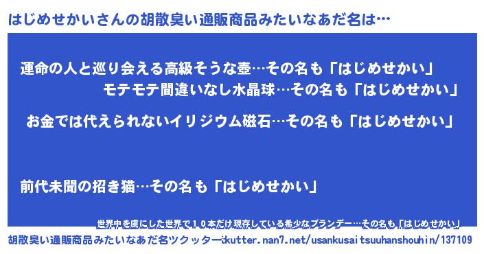 | 伝説のあだ名 | 『魔王と互角に渡り合う占い師はじめせかい』 |