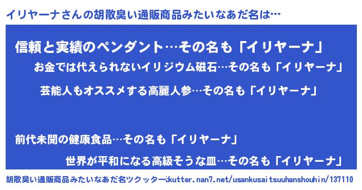 | 意味不明あだ名 | 『自称イリヤーナ』『永久保存イリヤーナ』 |