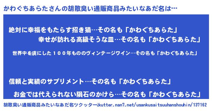 | 男性向けラノベタイトル風あだ名 | 『この素晴らしい世界にかわぐちあらたを!』 |