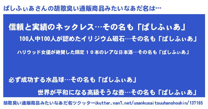 | 男性向けラノベタイトル風あだ名 | 『魔弾の王とぱしふぃあ』 |