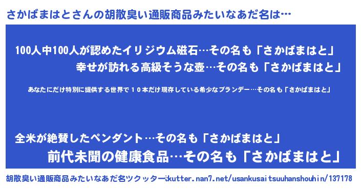 | 男性向けラノベタイトル風あだ名 | 『さかばまはと~年齢イコール彼女いない歴の魔法使い~』 |