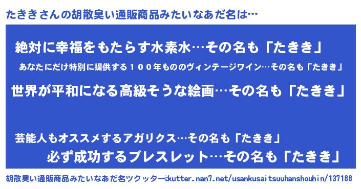 | 意味不明あだ名 | 『たききフォーエバー』『永久保存たきき』 |