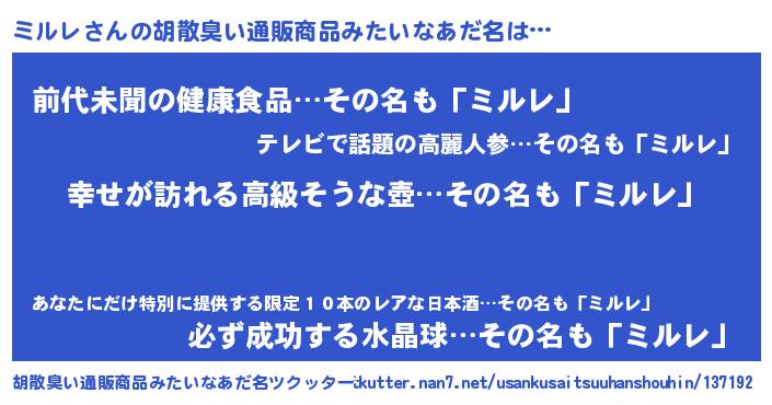 | 男性向けラノベタイトル風あだ名 | 『はたらくミルレさま!』『ミルレの憂鬱』 |