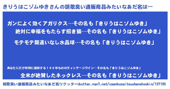 | 男性向けラノベタイトル風あだ名 | 『きりうはこゾムゆきの憂鬱』 |