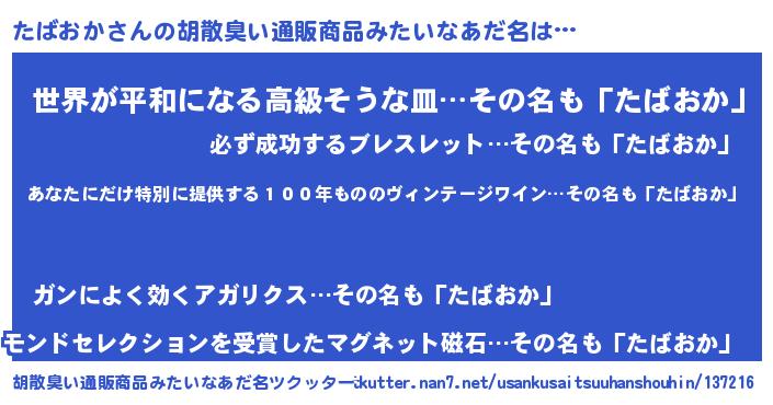 | 意味不明あだ名 | 『住所不定無職たばおか(4歳)』 |