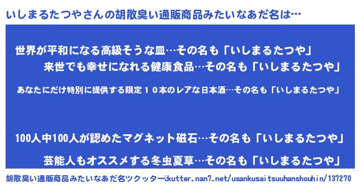 | 意味不明あだ名 | 『住所不定無職いしまるたつや(39歳)』 |