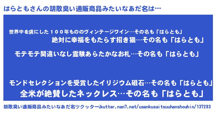 | 男性向けラノベタイトル風あだ名 | 『はらともの憂鬱』『魔弾の王とはらとも』 |