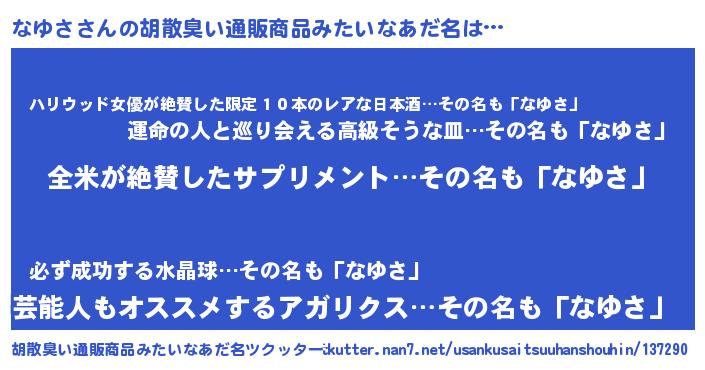 | 男性向けラノベタイトル風あだ名 | 『なゆさの嫁は女の子じゃないと思った?』 |
