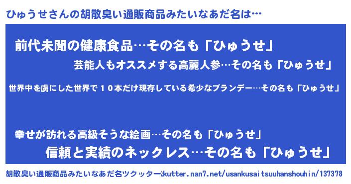 | 意味不明あだ名 | 『住所不定無職ひゅうせ(98歳)』 |