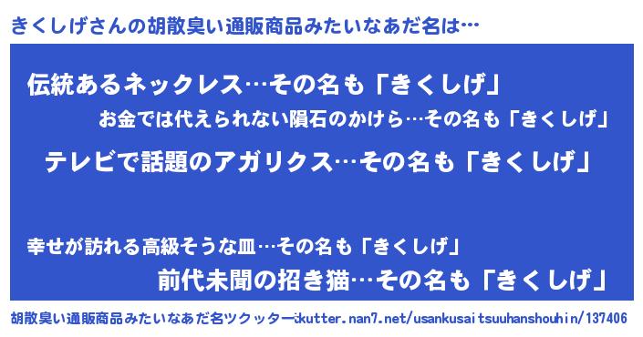 | 意味不明あだ名 | 『なめこ科きくしげ属』『自称きくしげ』 |