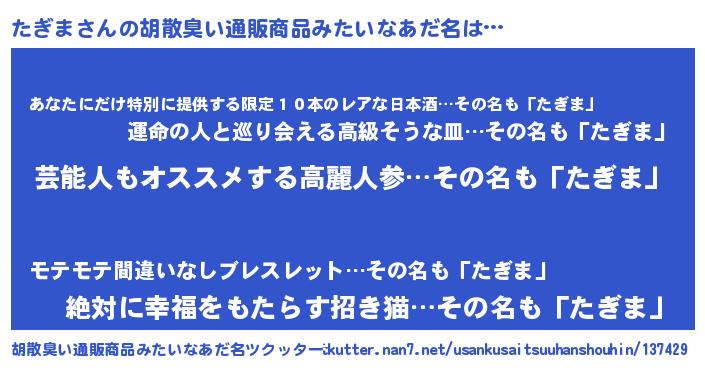 | 意味不明あだ名 | 『自称たぎま』『住所不定無職たぎま(65歳)』 |