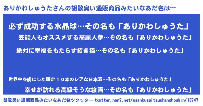 | ヘコむあだ名 | 『ありかわしゅうた(小並感)』『ありにゅー』 |