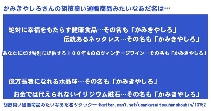 | 意味不明あだ名 | 『住所不定無職かみきやしろ(4歳)』 |