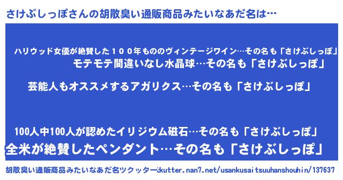 | 男性向けラノベタイトル風あだ名 | 『さけぶしっぽ~年齢イコール彼女いない歴の魔法使い~』 |